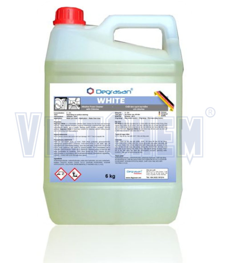 Degrasan White là chất tẩy rửa dạng bọt có chứa kiềm và chlorine dùng trong công nghiệp thực phẩm và đồ uống. Các hợp chất tẩy rửa vô cơ hiệu quả kết hợp với các chất cô lập chất lượng cao và các tác nhân tạo bọt cung cấp khả năng tẩy rửa hiệu quả. Degrasan White đặc biệt thích hợp để làm sạch các thớt cắt bị đổi màu và loại bỏ nấm mốc trên bề mặt.